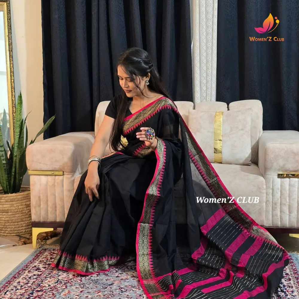 This elegant Aarong-style cotton saree is crafted from premium-quality cotton, ensuring comfort and breathability throughout the day. The classic black base is beautifully enhanced with a subtle copper-toned woven border, giving the saree a timeless and graceful appearance. The minimal striped pallu adds a refined touch, making it perfect for both everyday wear and semi-formal occasions.